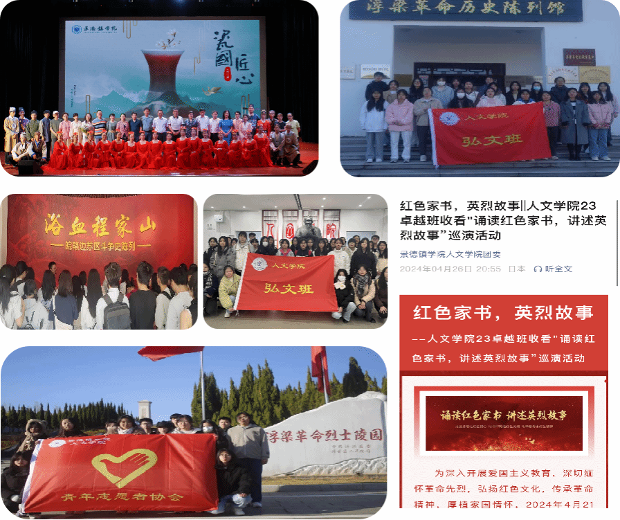 学院打造“红瓷茶韵”党建特色品牌,突出工作亮点,增强凝聚力和影响力。按照上级党组织指导要求,推动党支部建设改革,党支部建设与教研室工作紧密结合,党员教师牵头多项教学改革与科研项目,支委会在专业建设中发挥积极引领和保障作用。2024年,成立了中文党支部和文史党支部。中文党支部和汉语言文学专业紧密结合,党员教师发挥骨干作用。文史党支部和文博历史专业紧密结合,学科专业负责人和党员教师发挥引领作用。人文学院依托“1355”计划、“传承四艺”计划、“智享周三”计划等活动开展第二课堂,不断提升党建品牌建设的制度化、规范化水平,不断充实党建品牌的内涵。例如,启动“传承四艺”第二课堂,发挥党组织、党员在服务推动中心工作上的作用。党支部凝聚力显著增强,组织生活规范。教学科研水平稳步提升,优质课程涌现,科研项目立项增多,学生在学科和创业竞赛中成绩优异。文化传承创新能力增强,“红瓷茶韵”党建品牌获兄弟院校认可,学院接待多所高校考察,影响力有效提升。